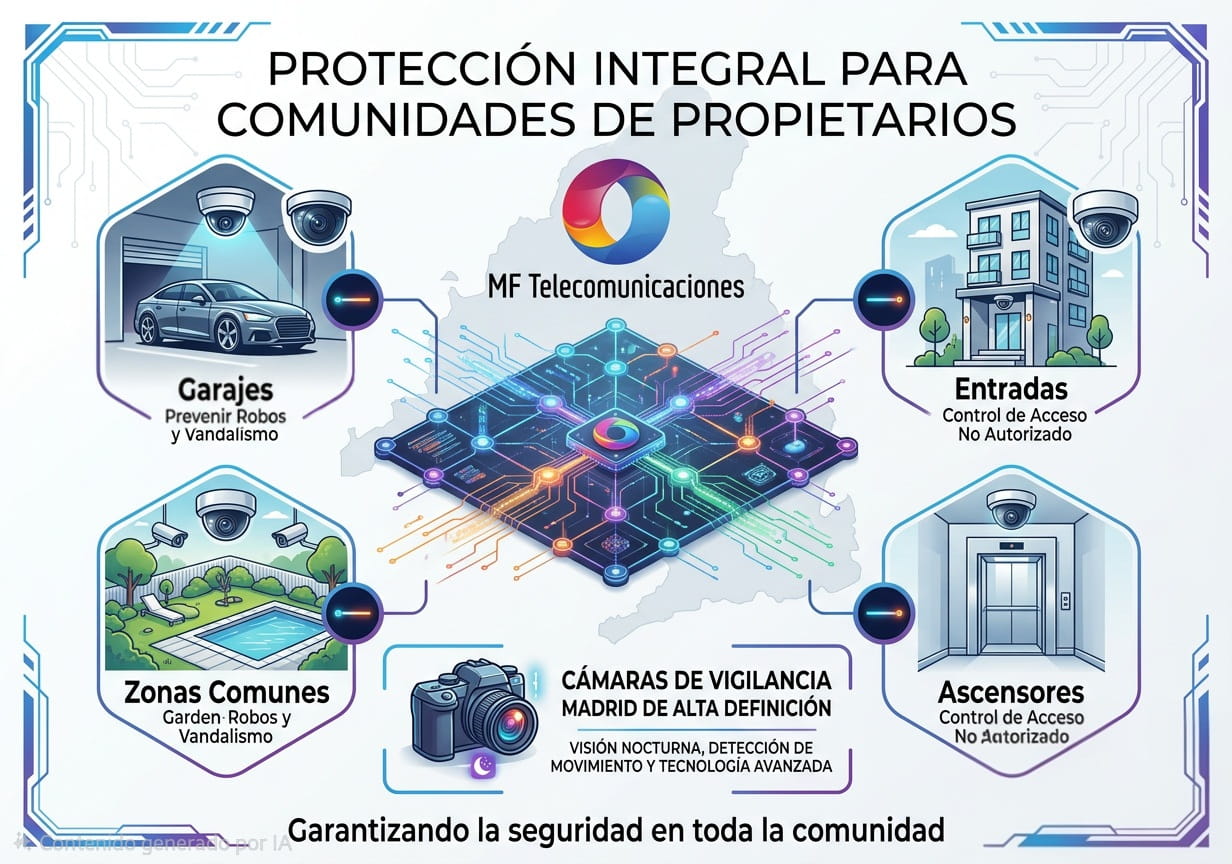 En MF Telecomunicaciones estamos especializados en la instalación de sistemas de videovigilancia para comunidades de propietarios, ofreciendo soluciones adaptadas a las necesidades de cada edificio y cumpliendo siempre con la normativa vigente en materia de protección de datos y seguridad.
